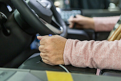 Auch die wichtigsten Fahrzeugfunktionen wie Blinken, Licht, Hupe oder Scheibenwischer lassen sich nun deutlich intuitiver bedienen. Früher nutzte Sabine dafür den sogenannten Bleeper – einen individuell im Fahrzeug installierten Knopf, der Befehle durch mehrmaliges Drücken auslöste. Bis zu zehn verschiedene Funktionen konnten so gesteuert werden; zwei Mal drücken bedeutete beispielsweise „Blinker rechts“. Die neue Technologie vereinfacht die Bedienung erheblich und sorgt für ein insgesamt angenehmeres Fahrerlebnis mit einem Plus an Sicherheit.